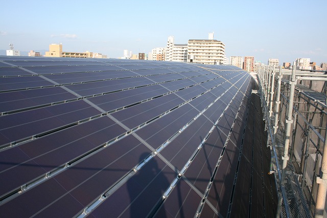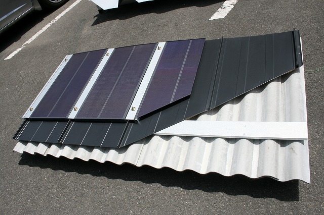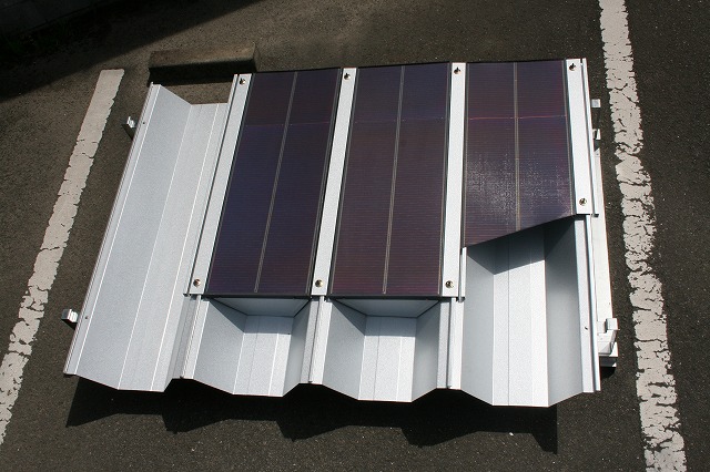 - 今後、パネル一体型モジュールによる産業用太陽電池の設置を行い、次のステップとして長尺折板屋根材に直接太陽電池モジュールを蒸着した屋根材一体型太陽電池の開発を行います。