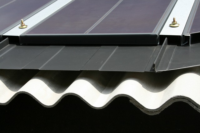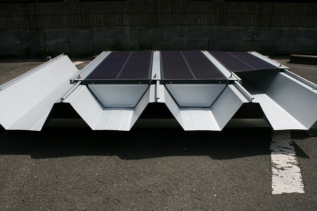 本システムは、特に工場や倉庫屋根に使用される長尺折板・波型スレート屋根材に設置が可能で、フィルム型アモルファス太陽電池を鋼板に接着した一体型太陽電池を、当社が開発した軽量の専用金具で既存の屋根にビス穴等を開けることなく設置できます。